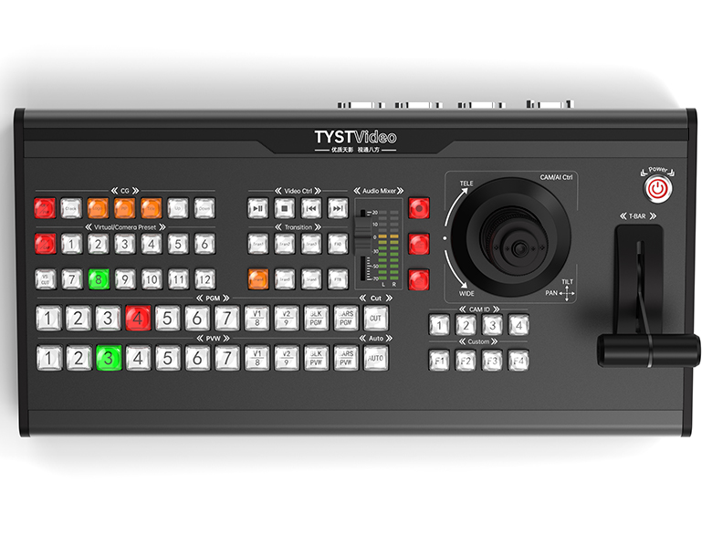 TY-3DVRPanel真三維虛擬切換臺是專為天影視通虛擬演播室系統(tǒng)設計的外置導播切換臺,外觀采用工藝鋁合金CNC陽極氧化工藝設計,操作按鍵以LED水晶按鍵為主,同時配備音量推子、T-Bar和PTZ云臺控制搖桿,TY-3DVRPanel與天影虛擬演播室系統(tǒng)集合可實現(xiàn)包括視頻切換臺、無軌虛擬場景跟蹤切換、直播、NDI采集、錄制、大屏輸出、攝像機云臺控制、調(diào)音臺、2D\3D專場、Tally輸出 等為一體的專業(yè)級硬件控制面板。它具備十足的現(xiàn)代感外觀和MIDI通訊協(xié)議接口,大幅加快現(xiàn)場節(jié)目的制作流程。面板采用曲線型按鈕,能夠降低誤操作的幾率。按鈕均采用背光設計,幫助您快速識別重要鍵控。此外,他還配備快速搜索盤和T型推桿等。按鈕支持動態(tài)顯示,所有按鍵支持自定義設置。